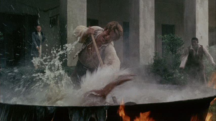It’s worth noting that whilst the story is critical of the culture it describes, it’s also highly indulgent of it, offering the spectacle of awesome masculine strength in Mede and the erotic never-never land to mitigate the bitter flavour of the amoral setting. Indeed, as in Italian muscleman movies and Conan the Barbarian, it’s the amoral, historical setting that gives the power fantasy it heft: you can see a similar thing working even in a film like Gladiator (2000), in which, in an inevitably losing game, the strong man subverts the ruling paradigm by dint purely of his physical potency. The film’s fascinating final act nonetheless veers in some unexpected directions, as Blanche violates the ultimate taboo in her society by screwing Mede and having his child. The efforts of the Woodfords to cover up the sin by killing the baby fail when Hammond insists on seeing the dead child. Stirred to a murderous intent all the more chilling because of his poise, he first, under the guise of caring for Blanche in her post-birth exhaustion, feeds her a poisoned glass of wine. He then sets out to kill Mede in the most hideous fashion, and the film reaches an apogee of appropriate madness as Hammond, after shooting Mede full of holes, presses him into the boiling water with a pitchfork. The literal act of rebellion comes not from Mede, but from Agamemnon, but Mede's final words nonetheless betray his shock and rage at discovering that Hammond is just another whitey, and a final rejection of mere obedience. The end impression of a world that’s locked into a spiral that can only end in self-annihilation is nihilistic, yet actually cathartic in a manner like Visconti’s The Damned (1969), in portraying such a nadir everything else seems an improvement.